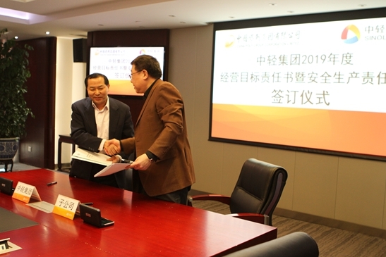 4月10日下午,中輕集團在中輕大廈舉行2019年度經營目標責任書暨安全生產責任書簽訂儀式。集團公司領導、總部各部室負責人、子公司主要負責人出席簽字儀式,黨委委員、副總經理任建平主持簽字儀式。