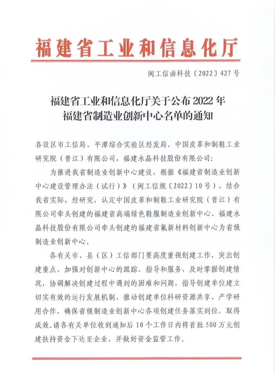 8月26日,福建省工業(yè)和信息化廳印發(fā)《福建省工業(yè)和信息化廳關(guān)于公布2022年福建省制造業(yè)創(chuàng)新中心名單的通知》,保利中輕所屬中國皮革制鞋研究院晉江公司榜上有名,牽頭創(chuàng)建運(yùn)營的福建省高端綠色鞋服制造業(yè)創(chuàng)新中心(簡(jiǎn)稱鞋服創(chuàng)新中心)被認(rèn)定為福建省級(jí)制造業(yè)創(chuàng)新中心。