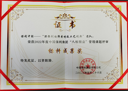 會議期間,舉行了“八維精益”優(yōu)秀成果頒獎典禮。保利集團從2022年“八維精益”各項工作成果中評選出83項優(yōu)秀成果獎,其中標桿成果獎6項。保利中輕榮獲標桿成果獎1項、優(yōu)秀成果獎10項,其中,“濕強劑的降本增效工藝創(chuàng)新”課題獲得標桿成果獎。該課題團隊通過不斷優(yōu)化濕強劑生產(chǎn)技術(shù)方案,成功研制出低成本高質(zhì)量生產(chǎn)技術(shù),提升了產(chǎn)品市場份額和競爭力,實現(xiàn)客戶成本降低15%。